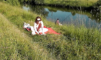 Nudist beach. Public nudity. Sexy MILF without panties and bra sunbathes naked is not bashful about fisherman. Naked in public. Milf